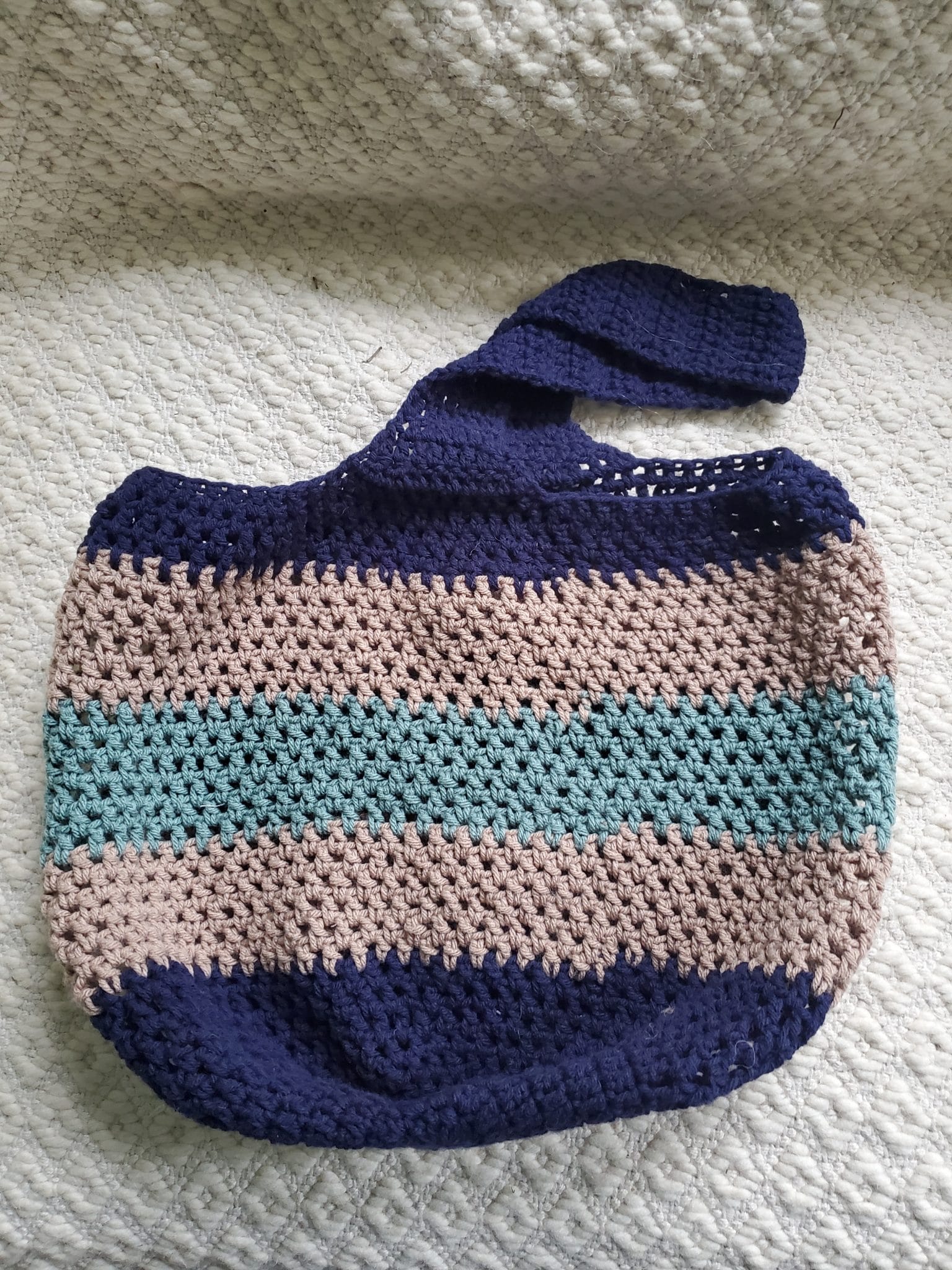 Measures 16″ deep, 18″ wide with 13″ strap. Machine wash, dry on low or lay flat. No dry clean. No iron.